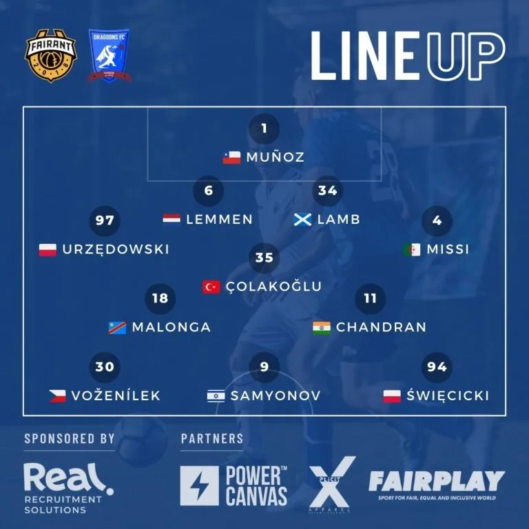 A minute later, the Dragoons came close to the opening goal through Błażej Święcicki. Great work from Rohit Chandran saw the Indian whirlwind take the ball past a couple of opponents. Chandran picked out Voženílek out wide and the Czech winger crossed into the Fairant box. Święcicki got on the end of the ball, volleying towards goal, but once again the Dragoons could not find the target.